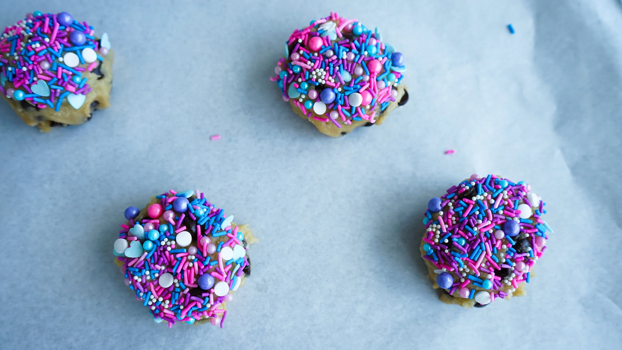 Cover with plastic wrap and set in the refrigerator for 10 minutes to let everything set. You can chill the dough overnight if you’d like, it may be harder to scoop out so let the dough come to room temp before you scoop it. Place sprinkles in a small bowl. Using a 2.5-oz. scooper, scoop the cookies, roll them in your hands, and drop them into the sprinkle mixture, coating the top of the cookie.