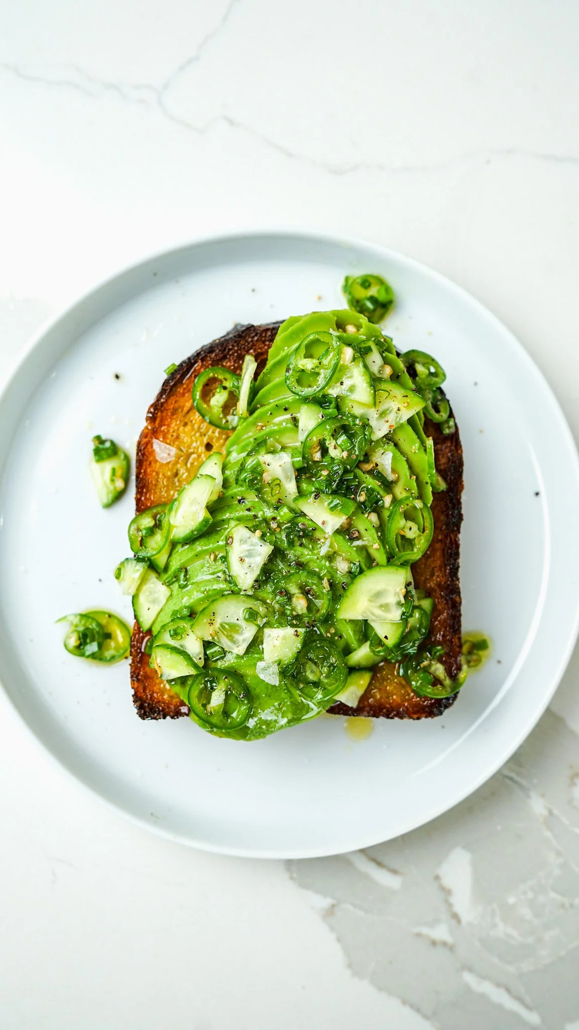 Fresh, clean, & spicy. This recipe is honestly so easy to make & will take your avocado toast from basic to exciting. I love the brightness of the cucumber with the spice of the jalapeños, the creaminess of the avoacdo with the crunch of the toast. I think you’ll enjoy it, too!